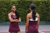 Thea and Simone stretch as they warmup for the match. The alums arrive and one of them is Thea's grandmother. She greets both women, and she was impressed by Simone's clip. She wants to play against both because they're the best. Thea warns that se should take it seriously. Simone runs over to Jordan and he's excited to see her play, but promises they can talk later.